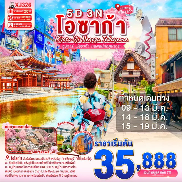 ทัวร์ญี่ปุ่น โอซาก้า นาโกย่า ทาคายามะ เกียวโต เมืองอุจิ ชมซากุระ วัดเบียวโดอิน เอ็กซ์โปซิตี้ หมู่บ้านมรดกโลกชิราคาวาโกะ 5 วัน 3 คืน