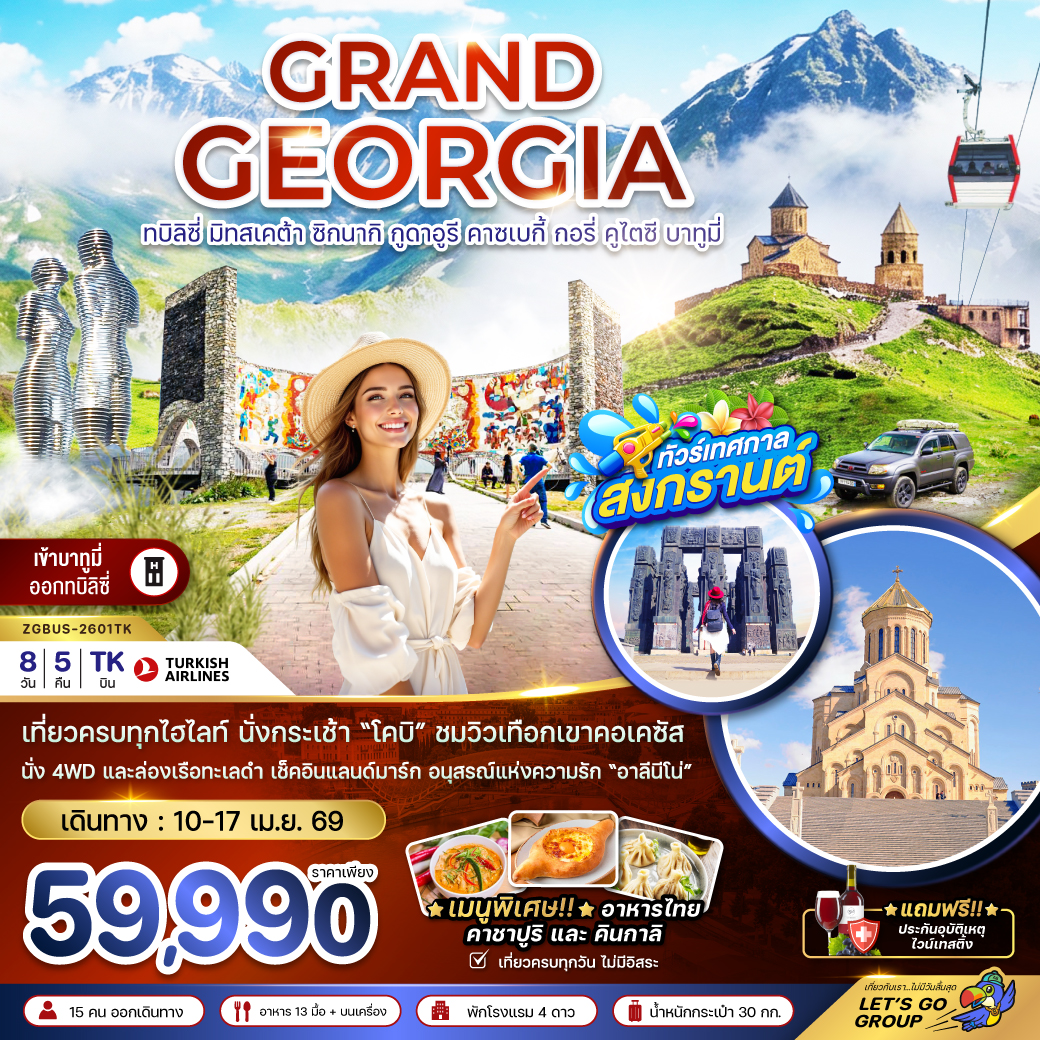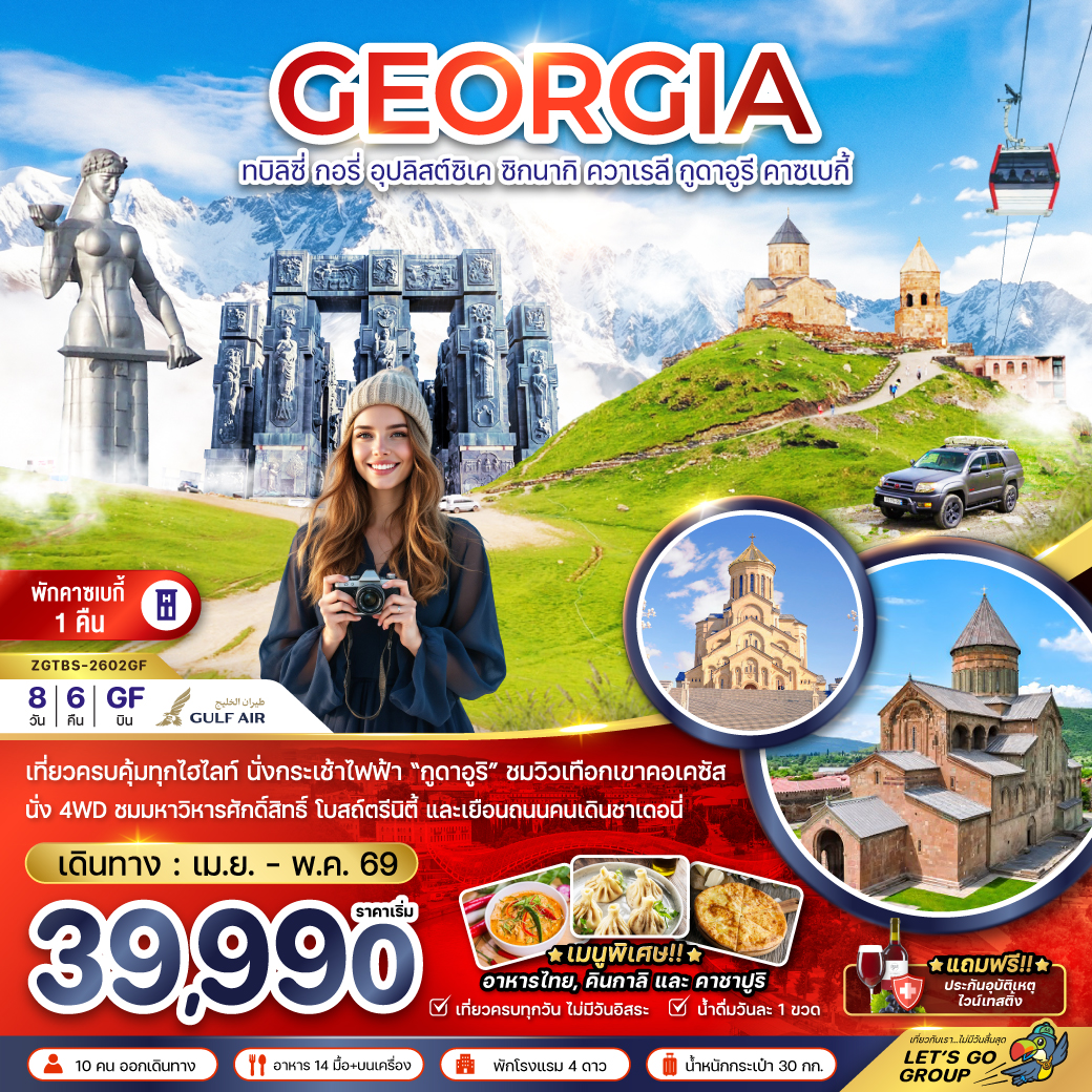 ทัวร์จอร์เจีย สงกรานต์ 2569 ทบิลิซี่ มิทสเคต้า ซิกนากิ กูดาอูรี คาซเบกี้ กอรี่ คูไตซี บาทูมี่ รถจี๊บ 4WD อนุสาวรีย์ประวัติศาสตร์จอร์เจีย 8 วัน 5 คืน