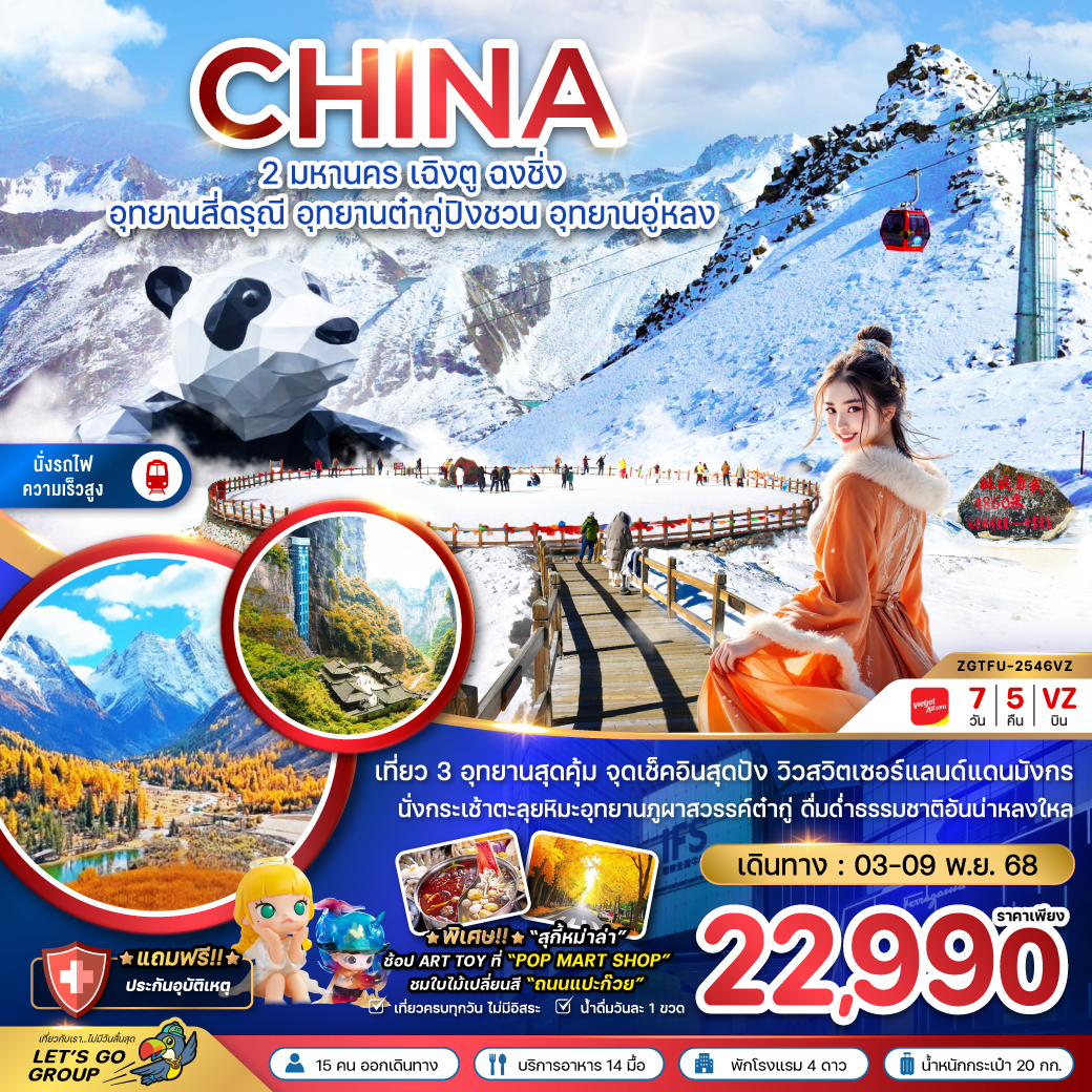 สนามบินสุวรรณภูมิ – สนามบินเฉิงตู – เมืองเฉิงตู - อุทยานหุบเขาสี่ดรุณี – หุบเขาชวงเฉียวโกว – เมืองเม่าเสี้ยน - เมืองเฮยสุ่ย – นั่งกระเช้าไฟฟ้า – อุทยานสวรรค์ภูผาหิมะการ์เซียต๋ากู่ปิงชวน – เมืองเฉิงตู - ถนนคนเดินชุนซีลู่ – แพนด้ายักษ์ปีนตึก IFS – นั่งรถไฟความเร็วสูงเฉิงตู-ฉงชิ่ง – เมืองฉงชิ่ง – ตลาดหงหยาต้ง - เมืองอู่หลง – ระเบียงแก้วอู่หลง – อุทยานแห่งชาติหลุมฟ้า สะพานสวรรค์ – ลิฟต์แก้ว – อุทยานเขานางฟ้า - เมืองฉงชิ่ง – ถนนแปะก๊วย – ถนนคนเดินเจี๋ยฟ่างเป่ย – ป๊อปมาร์ท – เซียะห่าวหลี่ โอลด์สตรีท –
