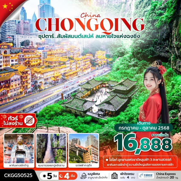 สนามบินดอนเมือง – ฉงชิ่ง วัดหลัวฮั่น-ถนนโบราณหลงเหมินฮ่าว-หงหยาต้ง - ฉงชิ่ง-อุทยานหลุมบ่อฟ้า+สะพานสวรรค์ (รวมลงลิฟต์แก้ว+รถอุทยาน+รถกอล์ฟ)-จุดชมวิวระเบียงแก้ว – ฉงชิ่ง-วัดฮงเอิน - พิพิภัณฑ์ศิลปะ(ตึกตะเกียบ) – ตึกคุ๋ยชิง ชั้น 22 นั่งรถไฟทะลุตึก-ช้อปปิ้งห้าง The Ring Mall-หมู่บ้านฉือชีโข่ว Optional : ล่องเรือแม่น้ำเหลียงเจียง 300 RMB/ท่าน - สนามบินฉงชิ่ง-สนามบินดอนเมือง กรุงเทพฯ