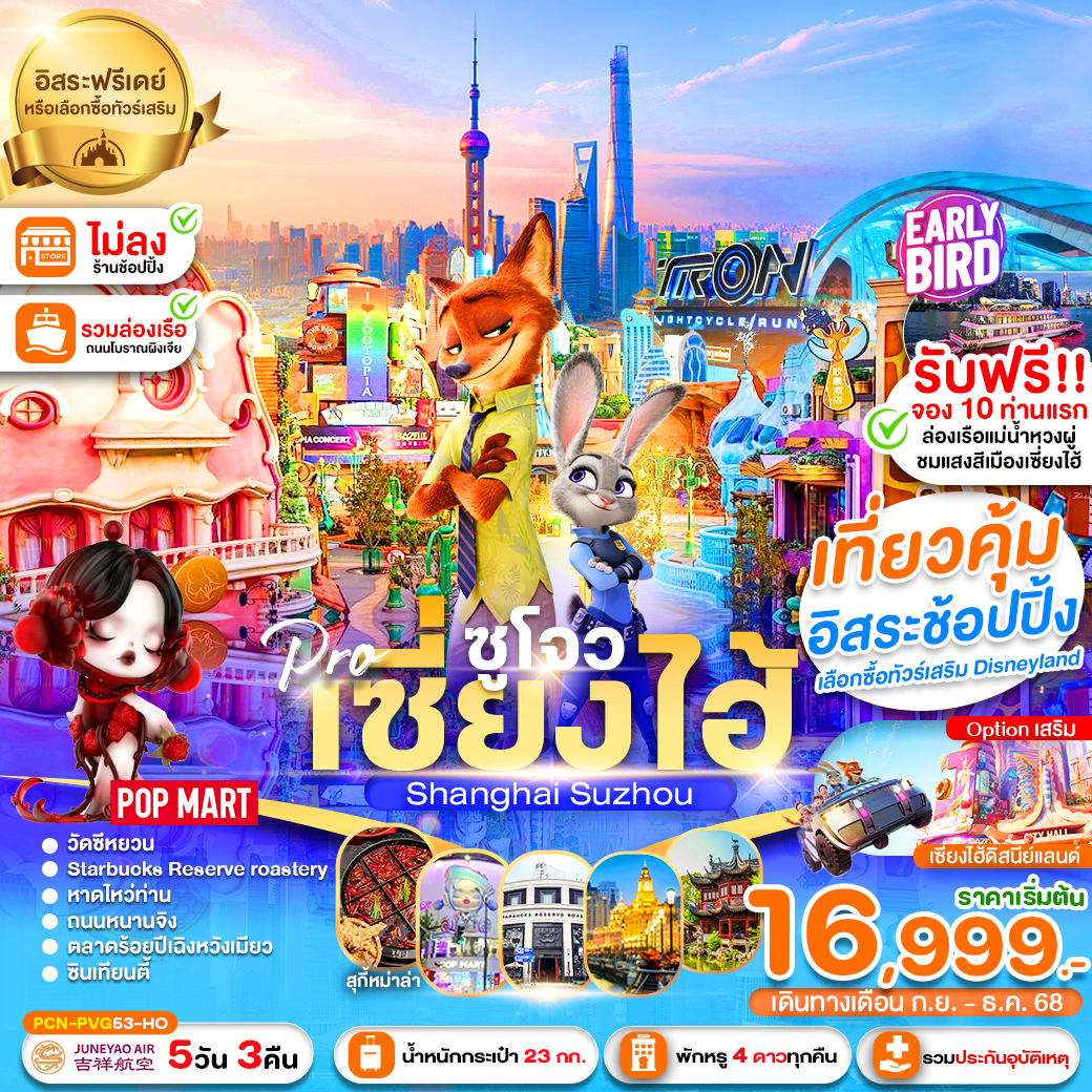 กรุงเทพฯ (สนามบินสุวรรณภูมิ) – สนามบินเซี่ยงไฮ้ – อู๋ซี - อู๋ซี – วัดพระใหญ่หลิงซานต้าฝอ (รวมรถแบตเตอรี่) – ศาลาฝานกง – ซูโจว – จัตุรัสหยวนหยง – ผ่านชม THE GATE OF THE ORIENT - ซูโจว – ล่องเรือหมู่บ้านโบราณจูเจียเจี่ยว – เซี่ยงไฮ้ – ถนนอู่คัง – หาดไว่ทาน – ถนนนานกิง + Popmart OPTION 1: ล่องเรือแม่น้ำหวงผู่ 300 หยวน/ท่าน OPTION 2: โชว์ ERA 400 หยวน/ท่าน - สวนสนุกเซี่ยงไฮ้ดิสนีย์แลนด์ (เต็มวัน) รวมบัตรค่าเข้า+รถรับส่ง - อาคารพันต้นไม้ – Starbucks Reserve Roastery – ตลาดร้อยปีเฉิงหวังเมี่ยว – Nor