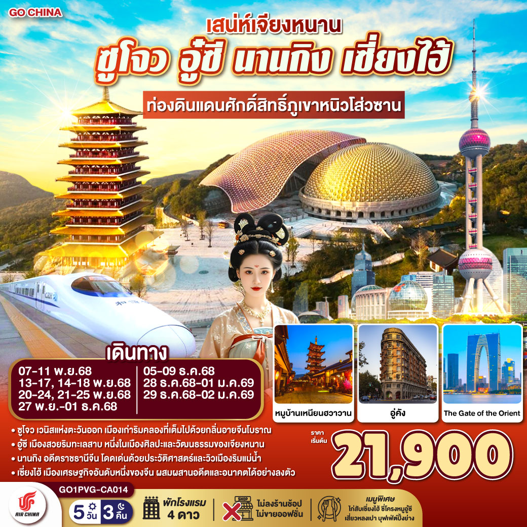 กรุงเทพฯ (สนามบินสุวรรณภูมิ) - เซี่ยงไฮ้ - ซูโจว – ผ่านชมทะเลสาบไก่ทอง – ประตูแห่งอนาคต – อู๋ซี – หมู่บ้านเหนียนฮวาวาน (ไม่รวมล่องเรือ) + ชมโชว์แสงสีเสียงยามค่ำคืน - อู๋ซี – นานกิง – เขาหนิวโส่วซาน – จัตุรัสเต๋อจี – ทิวทัศน์ยามค่ำคืนริมแม่น้ำฉินหวย - นานกิง – เซี่ยงไฮ้ (โดยรถไฟความเร็วสูง) – เมืองโบราณชีเป่า – ย่านลู่เจียจุ่ย – ลอดอุโมงเลเซอร์ – ถนนนานกิง - วัดหลงหัว – อาคารต้นไม้ Tian An 1,000 Tree – ถนนอู่คัง – ตรอกโบราณจ่างหยวน – Florentia Village Outlet - เซี่ยงไฮ้ (สนามบินเซี่ยงไฮ้ผู่ตง)