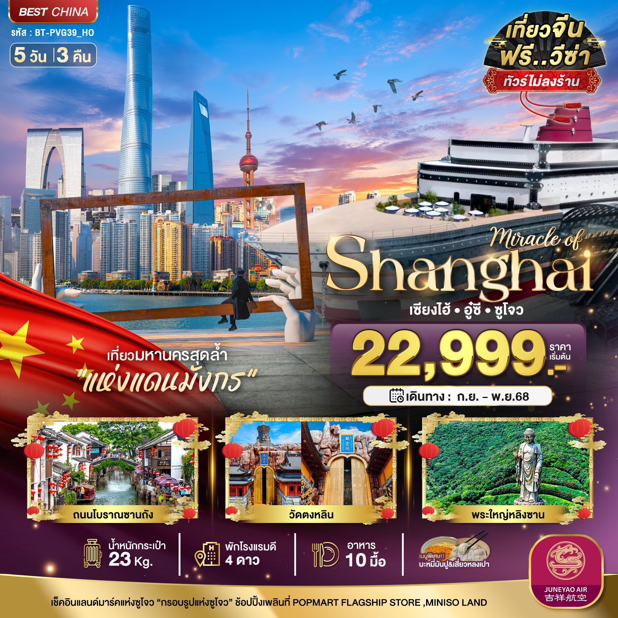 นัดพบ กรุงเทพฯ (สนามบินสุวรรณภูมิ) - สนามบินเซี่ยงไฮ้ – อู๋ซี – วัดพระใหญ่หลิงซานต้าฝอ (รวมรถแบตเตอรี่) – ศาลาฝานกง – หมู่บ้านเหนียนฮวาวาน NIANHUA WAN TOWN IN WUXI+ชมวิวตอนกลางคืน - ซูโจว – ทะเลสาบไก่ทอง – SUZHOU LARGE PHOTO FRAME THE GATE OF THE ORIENT – เมืองโบราณจูเจียเจี่ยว (ไม่รวมล่องเรือ) – เซี่ยงไฮ้ – ตลาดร้อยปีเฉิงหวังเมี่ยว - NORTH BUND GREENLAND – อาคารพันต้นไม้ Tian an 1000 Tree – อู่คัง – ซินเทียนตี้ – Starbucks Reserve Roastery – หาดไว่ทาน – ถนนนานกิง+POPMART - วัดพระหยก – FLORENTIA