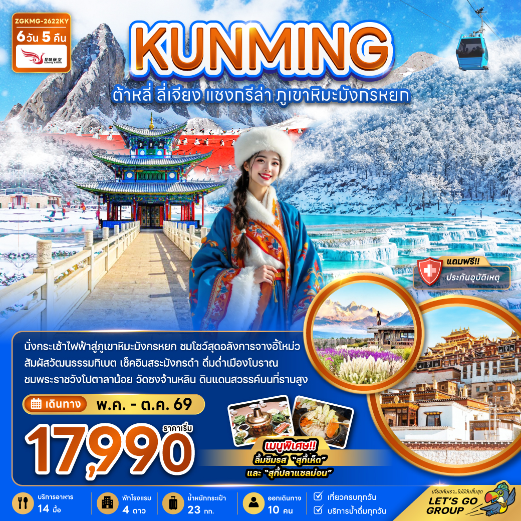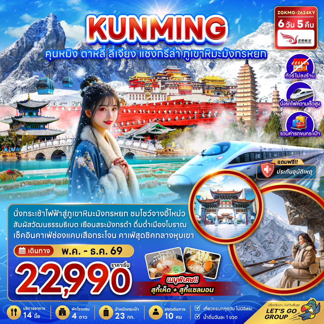 ทัวร์คุนหมิง ปีใหม่ 2570 แชงกรีล่า ลี่เจียง ต้าหลี่ ภูเขาหิมะมังกรหยก โชว์จางอี้โหม่ว ซ่องแคบเสือกระโจน 6 วัน 5 คืน (ทัวร์ไม่ลงร้านช้อป-นั่งรถไฟความเร็วสูง-รวมรถขนกระเป๋า)