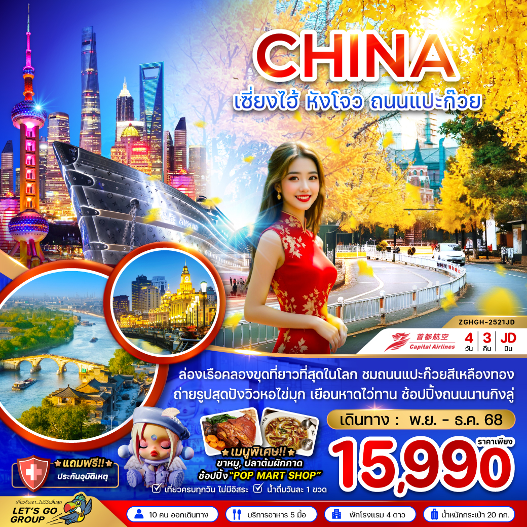สนามบินสุวรรณภูมิ – สนามบินหังโจว เซียวซาน – ถนนคนเดินเหอฝังเจี่ย - เมืองเซี่ยงไฮ้ – สะพานลอยลู่เจียจุ่ย – หอไข่มุก – ตึกวู่คั่ง – Tian an 1000 Trees – สตาร์บัคส์ รีเสิร์ฟ โรสเทอรี่ – เรือหลุยส์ วิตตอง – หาดไว่ทาน – ถนนนานจิง – ป๊อปมาร์ท โกลบอล แฟลกชิพ สโตร์ - เมืองหังโจว – ล่องเรือคลองขุดใหญ่ ปักกิ่ง–หังโจว – ถนนคนเดินหูปิน –ถ่ายรูปริมทะเลสาบซีหู – ถนนต้นแปะก๊วย – City Balcony Hangzhou – เอาท์เล็ต หังโจว - สนามบินหังโจว เซียวซาน – สนามบินสุวรรณภูมิ