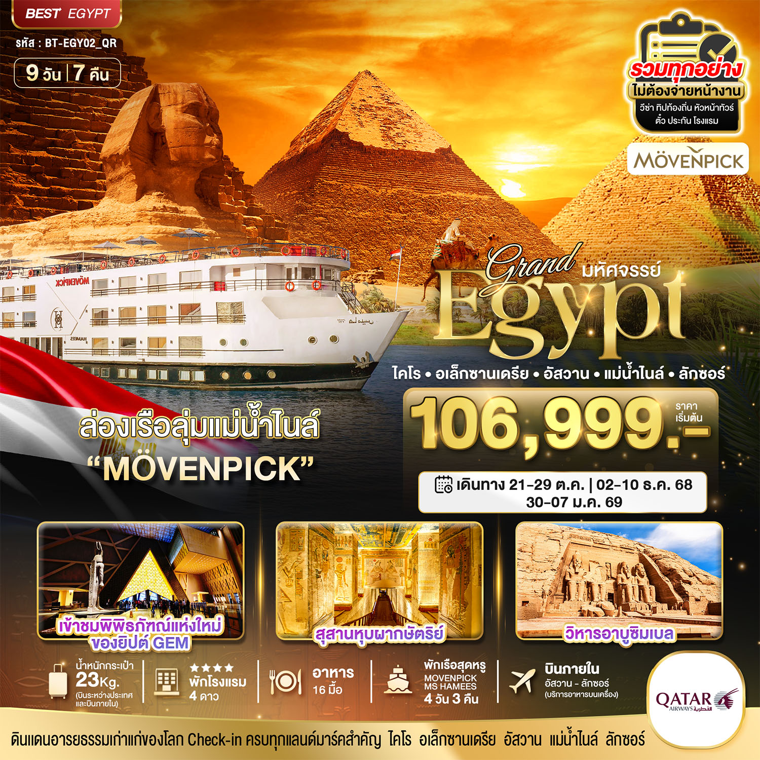 สนามบินสุวรรณภูมิ ประเทศไทย – สนามบินโดฮา ประเทศกาตาร์ - สนามบินไคโร ประเทศอียิปต์ - กรุงไคโร - กรุงไคโร – เมืองอเล็กซานเดรีย – หลุมศพใต้ดินแห่งอเล็กซานเดรีย - เสาปอม์เปย์ - ป้อมปราการเก่าแก่–ห้องสมุดอเล็กซานเดรีย–สาธิตวิธีทำกระดาษปาปิรุส-กรุงไคโร - กรุงไคโร - เมืองกีซ่า - มหาพีระมิดแห่งกีซา - มหาสฟิงซ์ – กิจกรรมการขี่อูฐ – พิพิธภัณฑ์แกรนด์อียิปต์ – กรุงไคโร - กรุงไคโร - สนามบินไคโร – สนามบินอัสวาน - เมืองอาบูซิมเบล – มหาวิหารอาบูซิ มเบล - มหาวิหารรามเสสที่ 2 – เมืองอัสวาน - Mövenpick MS Hamees